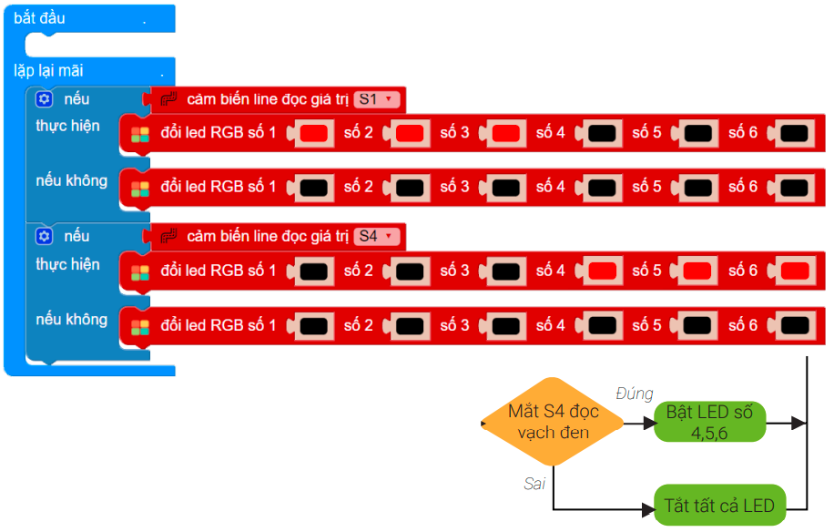 Tạo điều kiện thứ 2: Nếu mắt S4 đọc được vạch đen, bật đèn số 4, 5, 6. Nếu không, tắt đèn