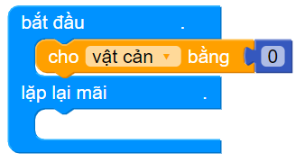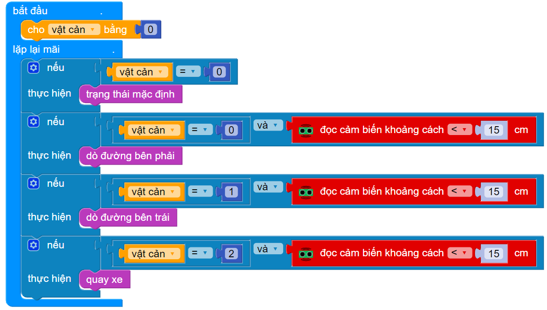 Đầu tiên, chúng ta tạo biến “vật cản” để Robot có thể nhận biết vật cản (trước, phải, trái). Mỗi lần gặp vật cản, biến này sẽ cộng thêm 1 và sẽ trở về 0 nếu không còn phát hiện vật cản.