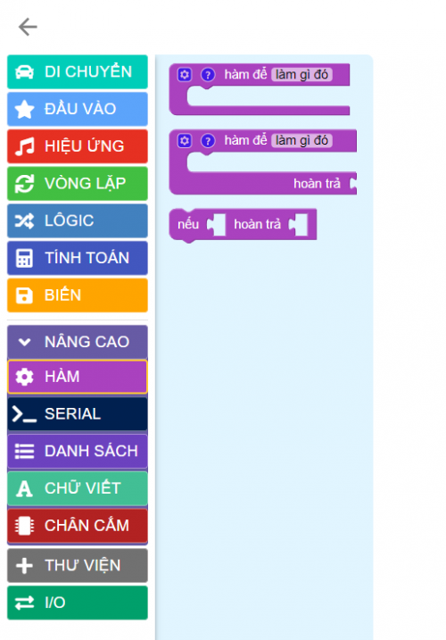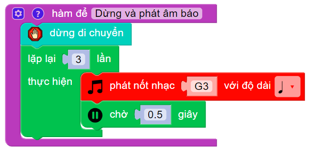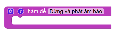 Bước 2: Chọn khối lệnh như bên dưới và đặt tên cho hàm tùy ý. Ở đây, chúng ta đặt là “dừng và phát âm báo”.