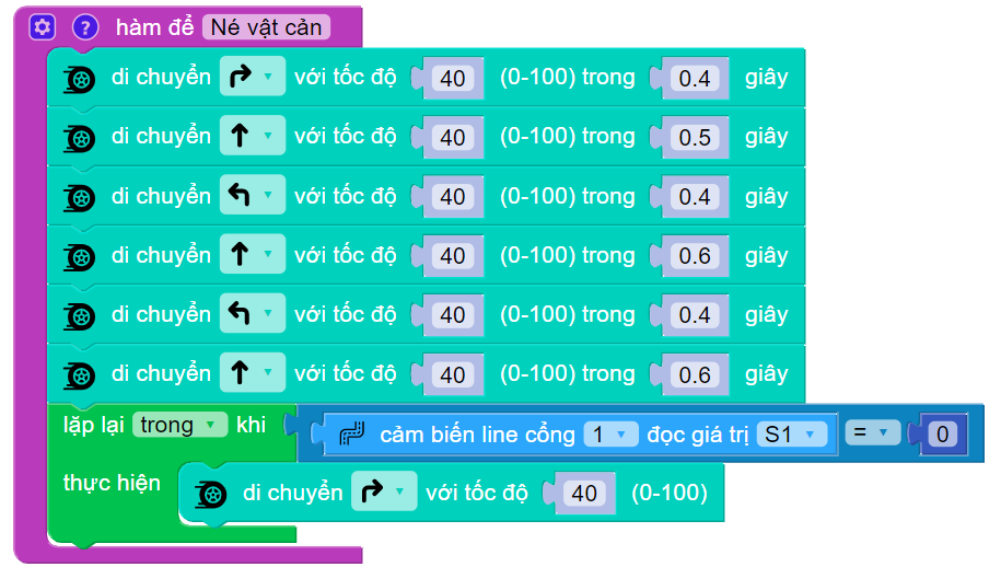 Tương tự như trên, ta tạo hàm có tên “né vật cản”.