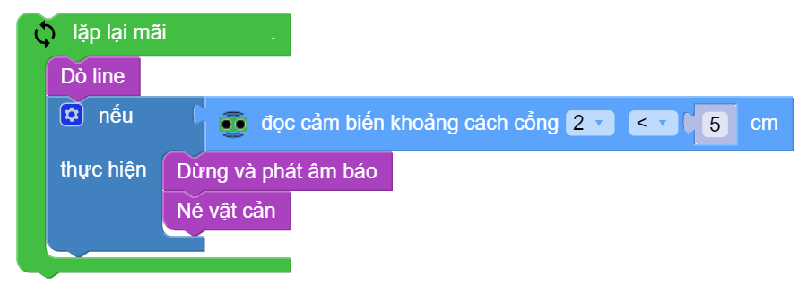 Lưu ý: Bạn cần phải tinh chỉnh thời gian chờ cho phù hợp với tình trạng của robot và kích thước của vật cản. Tốc độ và thời gian trong chương trình mẫu chỉ để tham khảo.