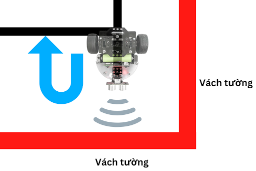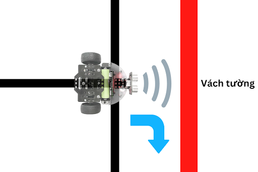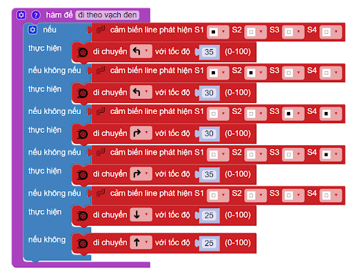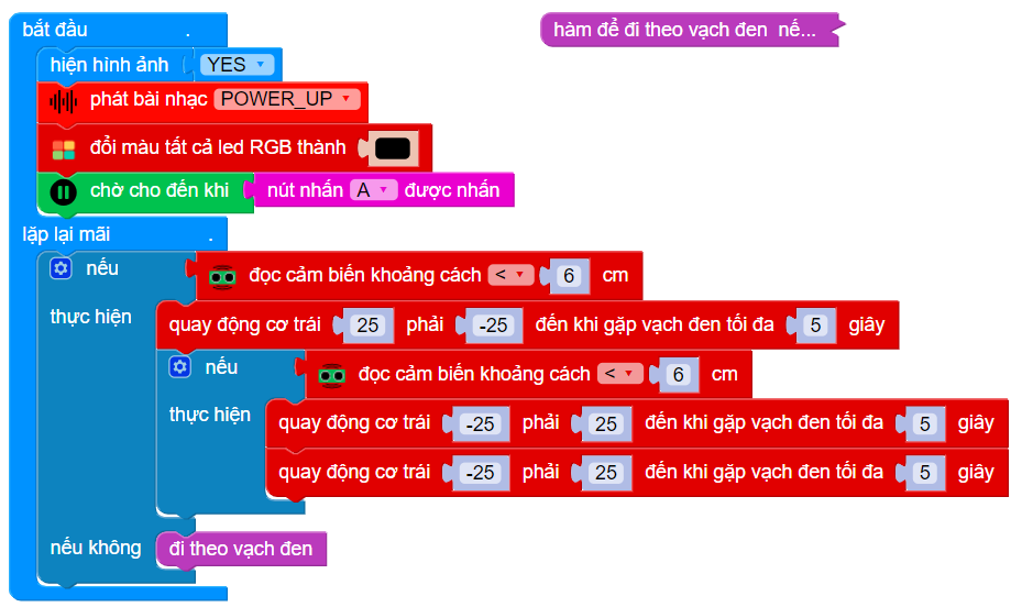 Trong trường hợp phía trước không có vách tường, robot cứ tiếp tục đi theo đường line đen theo chương trình mà chúng ta đã xây dựng trong hàm lúc nãy. Các khối lệnh này được đặt trong lặp lại mãi, để chúng luôn lặp lại liên tục.