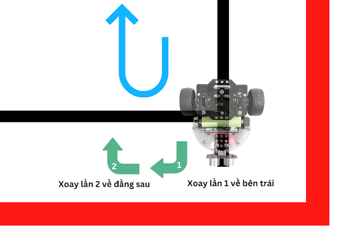 Giải thích: Khối lệnh “quay động cơ trái …” được sử dụng 2 lần liên tiếp, để đảm bảo robot có thể xoay 2 lần về đúng hướng còn lại: