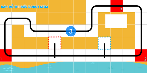 Để thực hiện nhiệm vụ này, Robot sẽ xuất phát tại vị trí ô vuông màu đỏ số 3, và kết thúc nhiệm vụ tại vị trí ô vuông màu đỏ số 1.