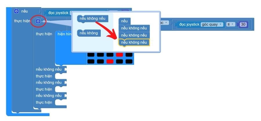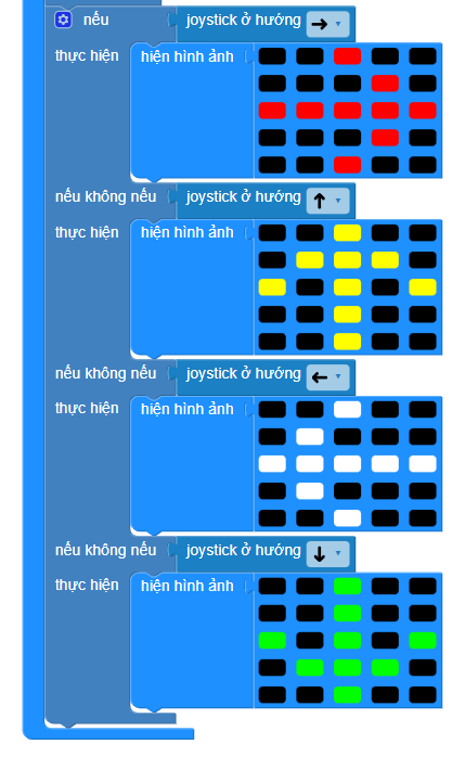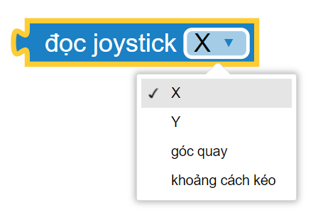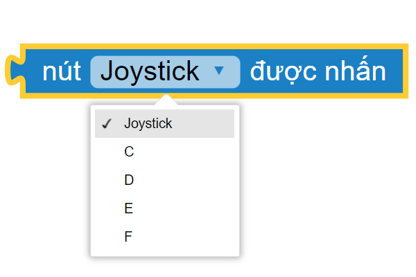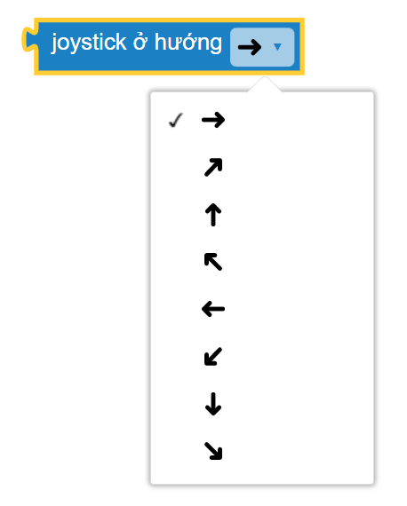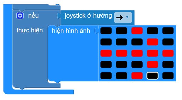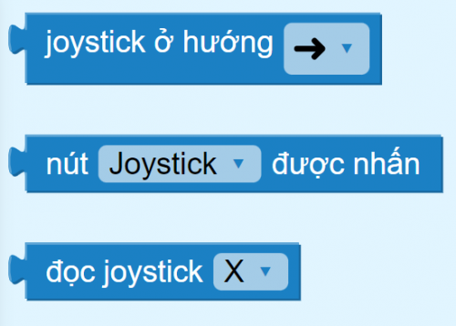 Để thực hiện điều này, chúng ta sẽ sử dụng khối lệnh Nút ____ được nhấn và khối lệnh Joystick ở hướng ___