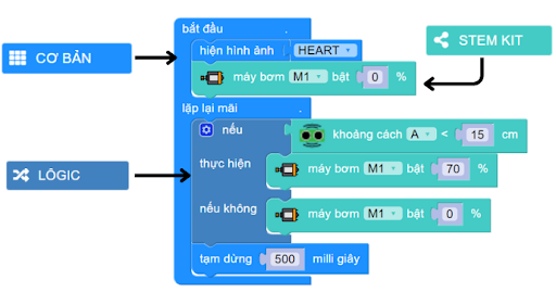 Lưu ý: Bạn cần đặt thêm câu lệnh tắt máy bơm trong phần bắt đầu để hạn chế việc máy bơm hoạt động ngay khi vừa bật nguồn.