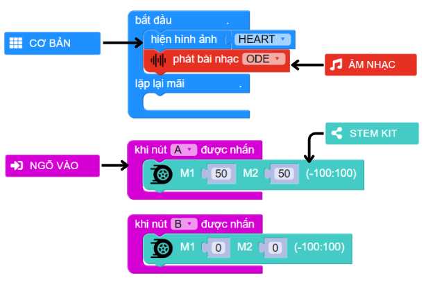 Khi nhấn nút A, robot sẽ di chuyển, tức là động cơ M1 và M2 cùng hoạt động ở tốc độ 50.