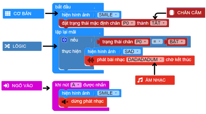 Khi chương trình bắt đầu, chúng ta sẽ đổi trạng thái mặc định của chân P0 thành tắt. Trong quá trình chơi game, nếu 2 thanh kẽm chạm nhau, khi đó chân P0 sẽ bật tạo thành một mạch điện hoàn chỉnh, lúc này sẽ hiện hình ảnh SAD và phát bài nhạc DADADADUM để báo hiệu.