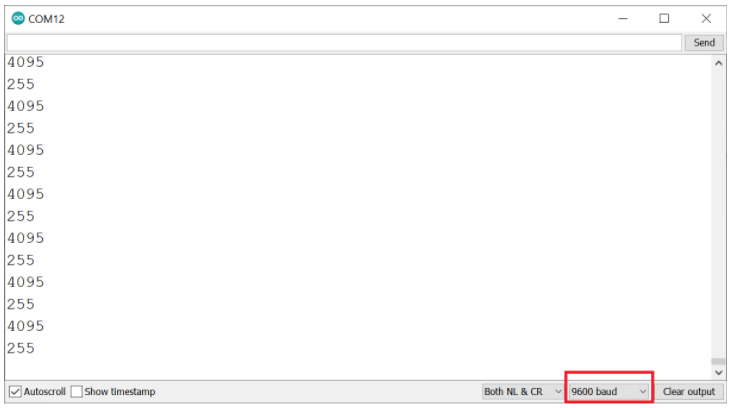 Khởi tạo giao tiếp Serial với tốc độ (baud rate) là 9600. Để thông tin hiển thị đúng trong cửa sổ Serial, bạn phải chọn tốc độ truyền nhận (ở góc dưới bên phải của giao diện màn hình Serial) đúng với giá trị dùng để khởi tạo trong chương trình.