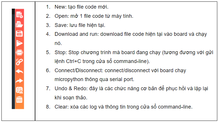 Terminal bên dưới khu vực soạn thảo code: đây là command-line của micro-python, giúp chúng ta dễ dàng tương tác với board, có thể chạy trực tiếp các lệnh hoặc stop các chương trình đang chạy bằng Ctrl+C. Đây cũng là cửa sổ giúp chúng ta in ra các thông tin trong quá trình debug.