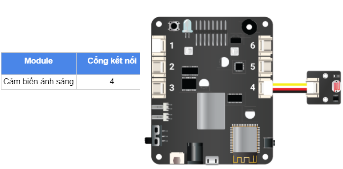 Đặt biến light_value là giá trị tín hiệu Analog ở chân IO được chỉ định. Do cảm biến ánh sáng trả về tín hiệu Analog và được kết nối với cổng số 4 trên xController nên ta dùng pin41.read_analog(). Lúc này biến light_value sẽ trả về giá trị kiểu số nguyên (int) nằm trong khoảng từ 0 đến 4095.