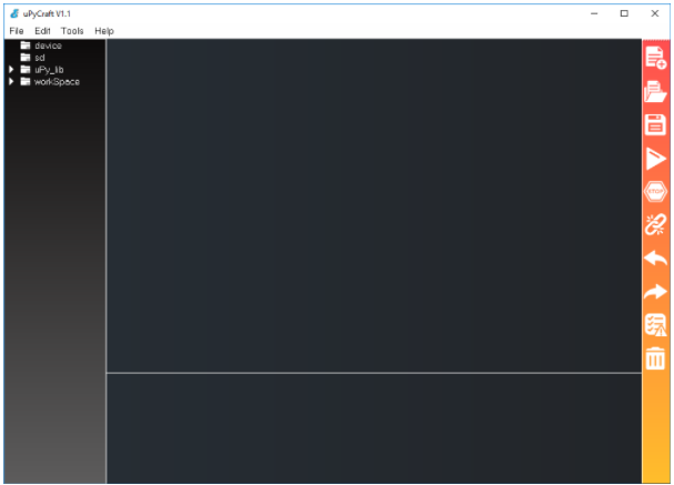 Đối với uPyCraft IDE, bạn không cần thực hiện bất cứ các thao tác cài đặt phức tạp nào, chỉ cần tải về file thực thi ở trên về rồi nháy đúp chuột để khởi động nó, một cửa sổ mới được mở ra như hình dưới là bạn đã có thể sử dụng nó.