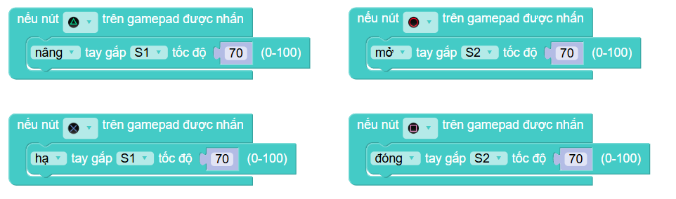 Trong danh mục khối lệnh ROBOCON sẽ có 1 mục Gamepad sẽ có các khối lệnh với chức năng như sau: