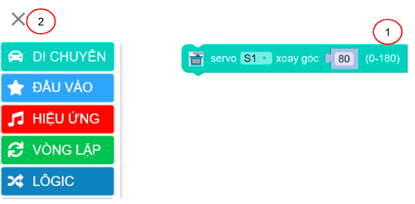 Giao diện lập trình mở ra, bạn chỉ cần kéo thả khối lệnh sau ra vùng lập trình. Chọn góc 80 độ với mục đích, khi nhấn vào nút này, tay gắp sẽ thực hiện việc gắp vật. Và trở về giao diện Bảng điều khiển.