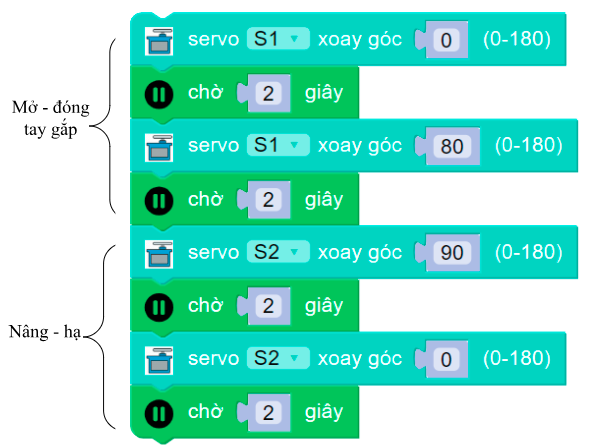 Yêu cầu: Lập trình robot mở - đóng, nâng - hạ tay gắp sau mỗi 2 giây. Lặp lại liên tục