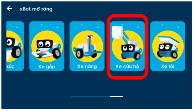 Vào VovinamStem App > Chọn thiết bị xBot > Mở rộng > Xe cứu hộ.