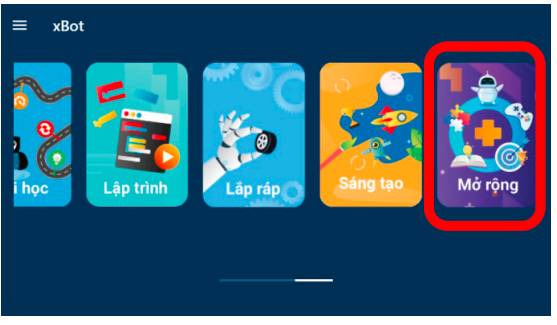 Vào VovinamStem App > Chọn thiết bị xBot > Mở rộng > Xe gắp.