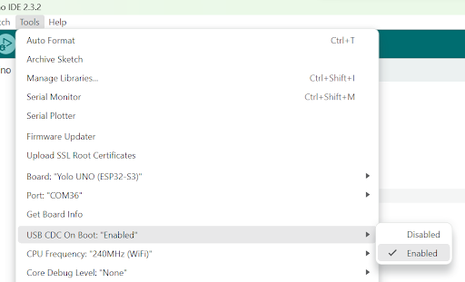 Trước khi upload chương trình, bạn cần kiểm tra và đảm bảo lựa chọn USB CDC On Boot được bật như dưới đây để có thể xem được các giá trị in ra cửa sổ Serial: