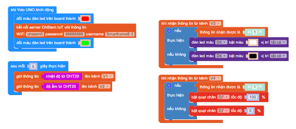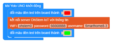 Giải thích: Khi Yolo UNO khởi động, đèn LED trên board sẽ đổi màu đỏ. Sau khi kết nối thành công với wifi và bảng điều khiển IoT, đèn LED trên board sẽ sáng xanh.