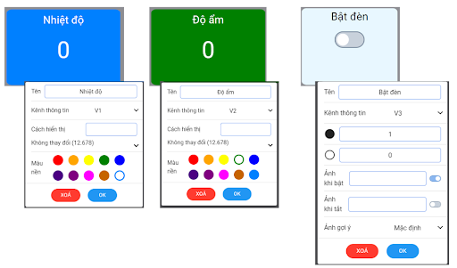 Kéo thả các widget ra màn hình bảng điều khiển. Đặt lại tên của widget và kênh thông tin (Mỗi đối tượng sẽ chọn 1 kênh thông tin khác nhau)