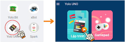 Mở tab mới và truy cập vào https://app.vovinam-map.org/. Chọn thiết bị lập trình Yolo UNO và chọn Lập trình.