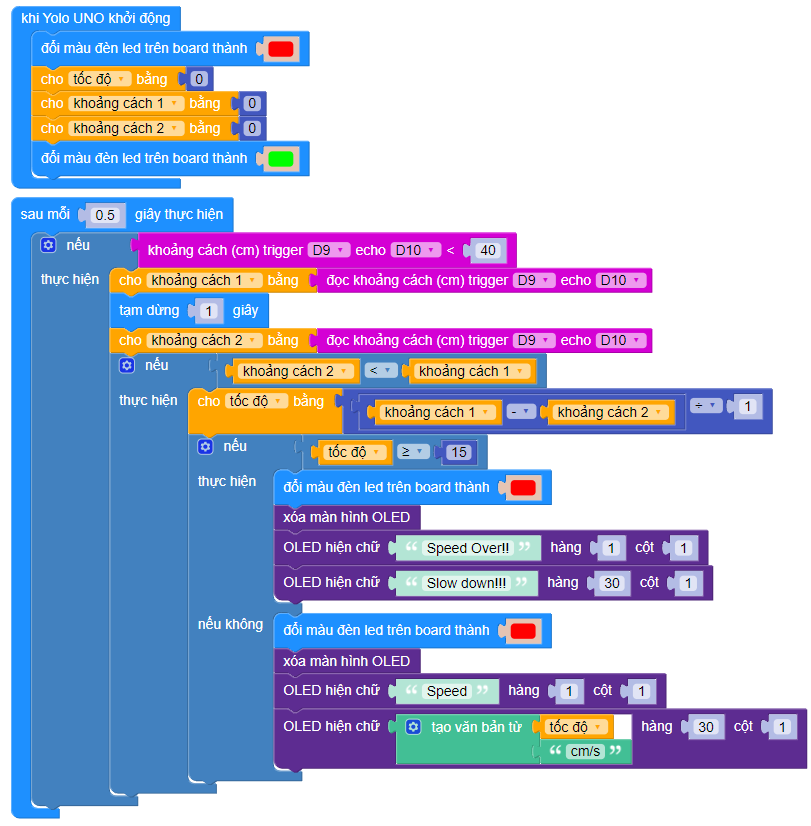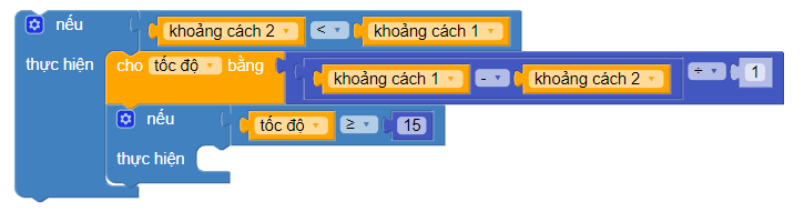 Lồng điều kiện nếu xe đang tiến lại gần (khoảng cách 2 < khoảng cách 1) vào bên trong Áp dụng công thức tính vận tốc vào và gán giá trị tính được vào biến tốc độ (thời gian là 1 giây):