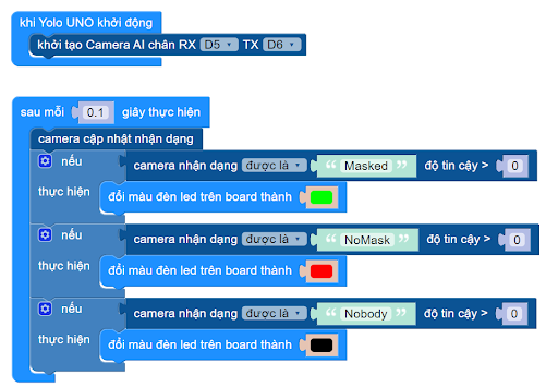 Với hướng dẫn này, chúng ta sẽ thực hiện dự án nhận diện hình ảnh với Camera AI. Nếu phát hiện có mang khẩu trang, Yolo UNO sẽ bật đèn xanh, bật đèn đỏ nếu không đeo khẩu trang. Ngược lại, thì tắt đèn.