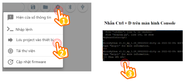 Để chương trình luôn được lưu lại trong Yolo UNO và vận hành như một ứng dụng thực tế, bạn cần lưu nó vào mạch. Quy trình thực hiện cũng khá tương đồng với bước chạy thử, nhưng lần này, chúng ta sẽ chọn Lưu dự án vào thiết bị, như minh họa ở hình bên dưới: