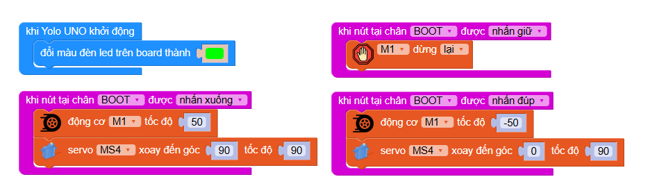 Khi nhấn nút Boot, động cơ M1 sẽ quay với tốc độ 50, đồng thời servo 4 sẽ quay đến vị trí 90. Khi ấn đúp (ấn 2 lần) nút B thì động cơ M1 với tốc độ 50 và servo 4 sẽ quay về vị trí 0. Khi ấn giữ nút Boot thì động cơ M1 sẽ dừng quay.