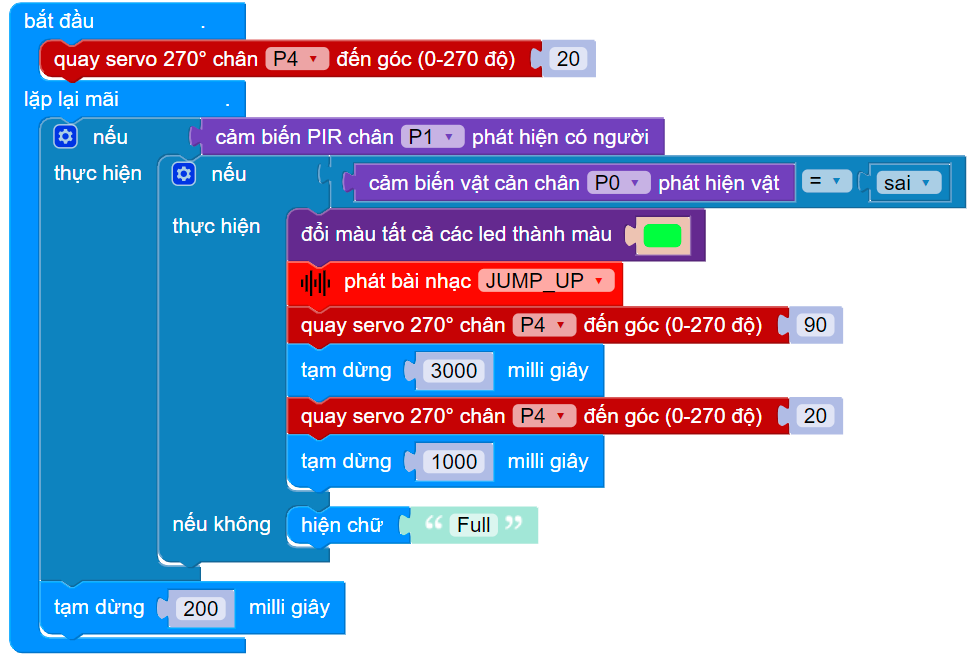 Lồng điều kiện ghép vào bên trong: nếu thùng rác chưa đầy (cảm biến vật cản không phát hiện có rác trong thùng, khối lệnh có giá trị sai)