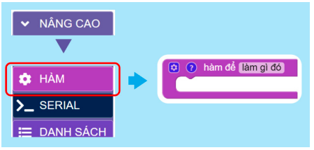 Chọn mục Nâng cao >> Hàm: sử dụng khối lệnh hàm để làm gì để tạo hàm.