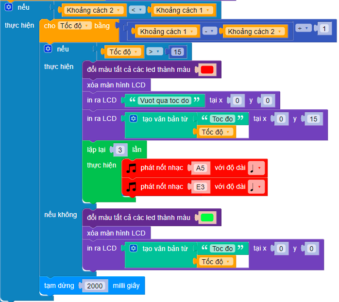 Nếu tốc độ quá hạn mức quy định (15), ta tiến hành bật đèn LED thành màu đỏ và xóa màn hình LCD: