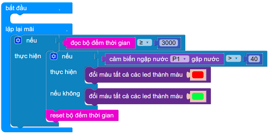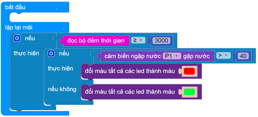 Đặt điều kiện: nếu đọc cảm biến ngập nước > 40%