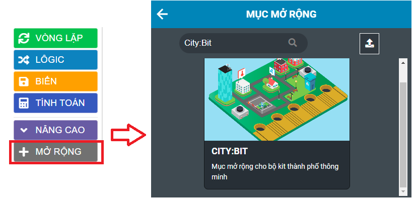 Bước 1: Chọn mục “Mở rộng” và chọn thư viện mở rộng City:Bit