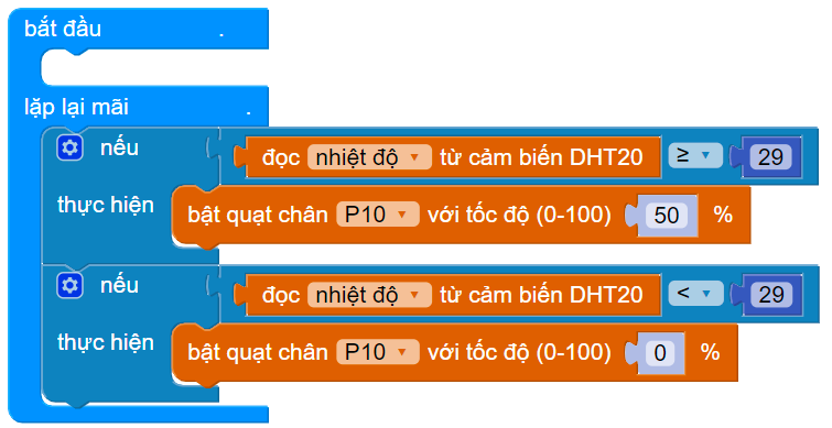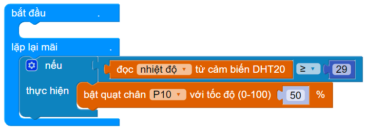 Tạo điều kiện: Nếu đọc nhiệt độ ≥ 29, thực hiện bật quạt với tốc độ 50