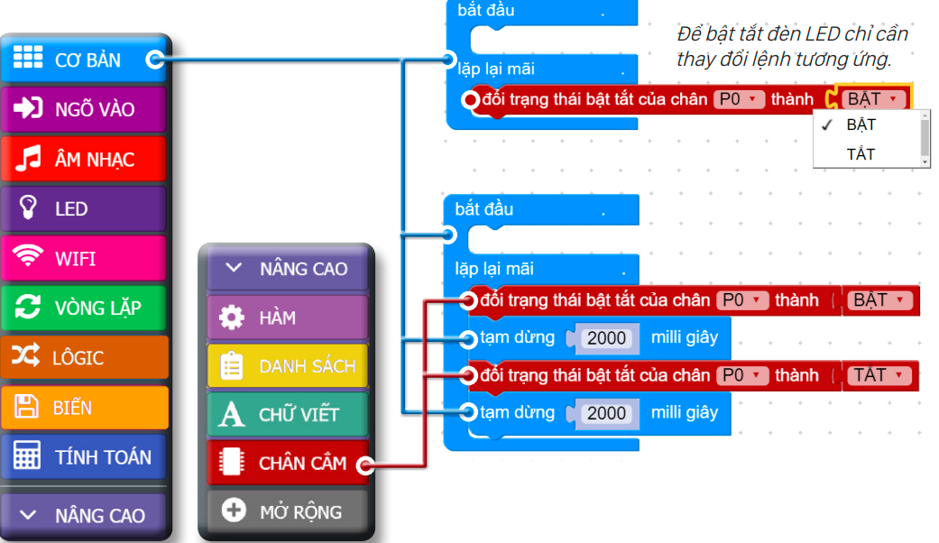 Bạn cũng có thể kết hợp bật và tắt LED sau mỗi 2 giây để tạo thành hiệu ứng LED chớp tắt như trên.