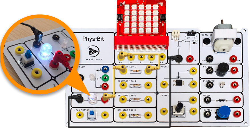 Lỗ cắm GND trên Phys:Bit là cực âm của nguồn điện, lỗ cắm 3V là cực dương của nguồn. Chân cắm P0 có thể đóng vai trò như cực âm khi chân P0 tắt và đóng vai trò như cực dương khi P0 bật.