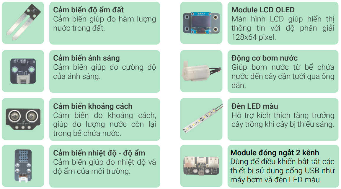 Với bộ Kit này, bạn sẽ làm quen với các công nghệ mới trong nông nghiệp, từ đó sáng tạo nhiều dự án nâng cao hơn.